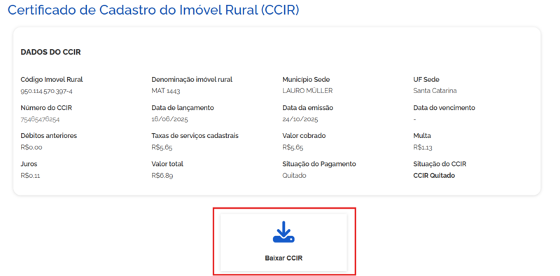 3- Em seguida basta clicar para baixar CCIR, caso apareça para Realizar Pagamento, podemos estar efetuando internamente e cobrando o cliente em seguida ou podemos informar o cliente que ele tem que quitar o CCIR dele: