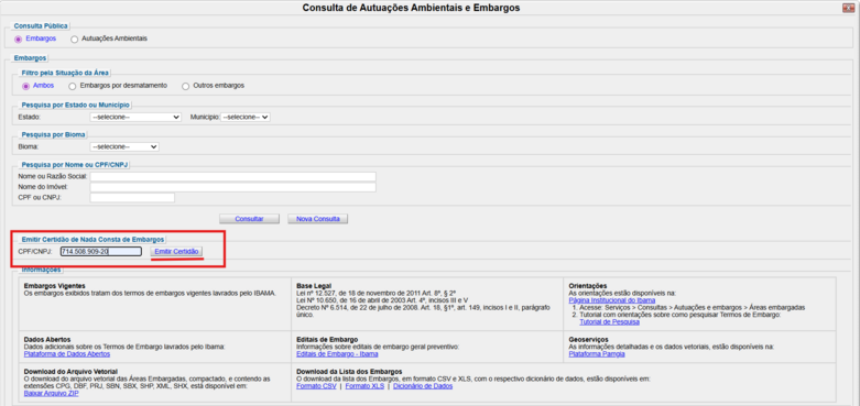 [editar | editar código-fonte]CONSULTA DE AUTUAÇÕES AMBIENTAIS E EMBARGOS, basicamente, se a pessoa tem algum problema ou não com o Ibama.