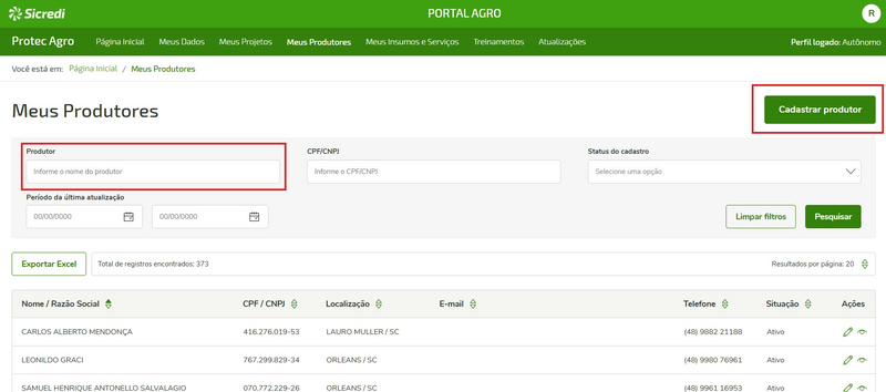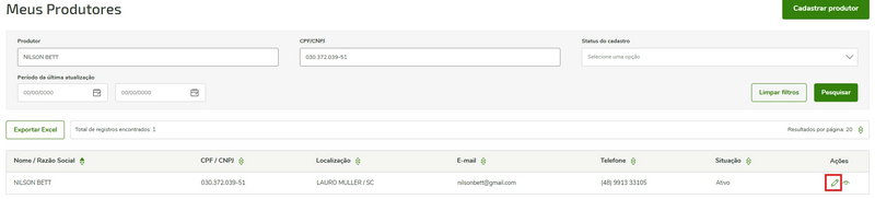 Caso tenha que fazer o cadastro do zero, clicamos em Cadastrar produtor, mas caso já tenha e queremos atualizar, basta Pesquisar pelo nome: