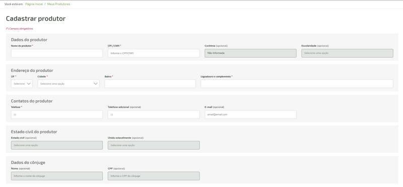 [editar | editar código-fonte]Para cadastrar o produtor, basta preencher com os dados dele nos campos: