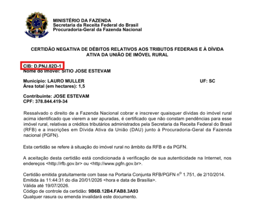 1- Primeiro temos que pegar o documento do ITR antigo e pegar o número do CIB, caso não tenha um ITR ainda, em alguns casos no documento da matricula aparece: