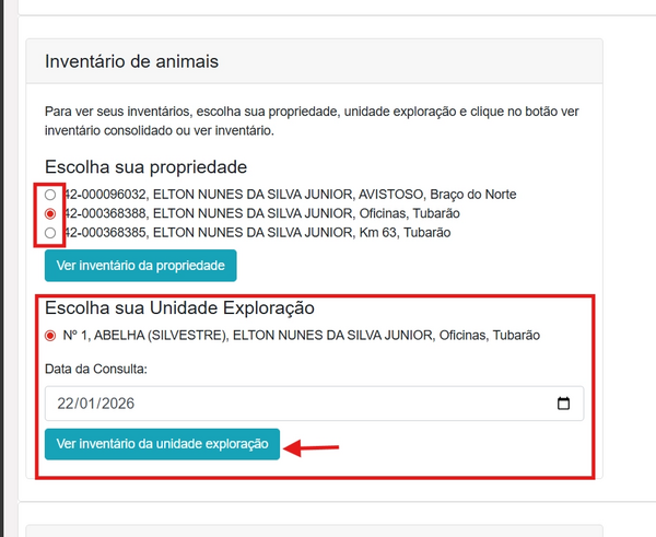 3- Na aba Home, desce com o mouse até achar a opção Inventário de animais, escolha uma propriedade, em muitos casos vai ter pegar de cada propriedade, ao escolher uma, vai abrir uma aba abaixo, Escolha sua Unidade Exploração, dai escolhe o animal e clique para Ver inventário da unidade exploração: